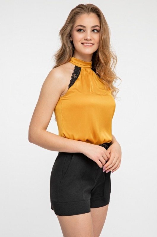 Шовкова блуза з високим коміром, прикрашена ніжним мереживом з боків, а ззаду зав'язується на бант.