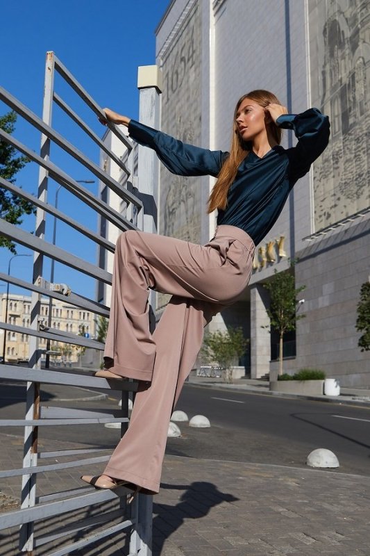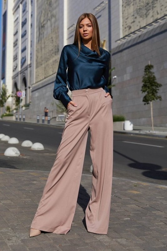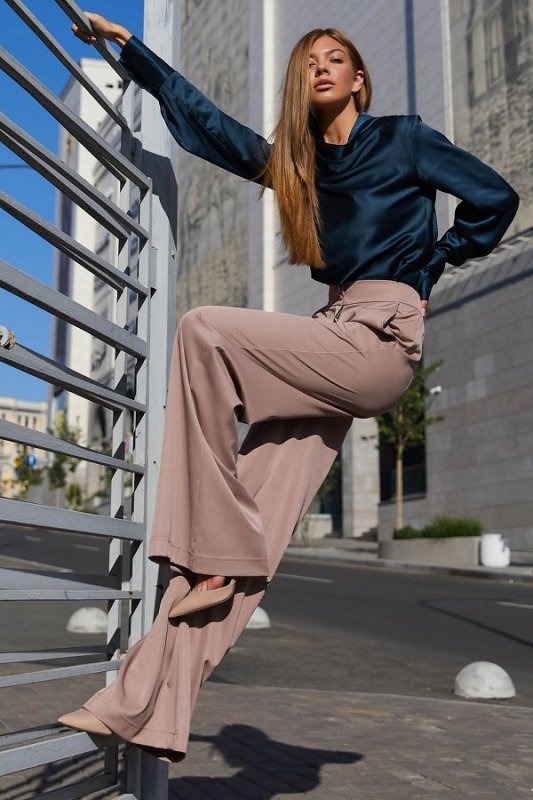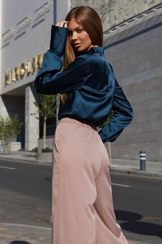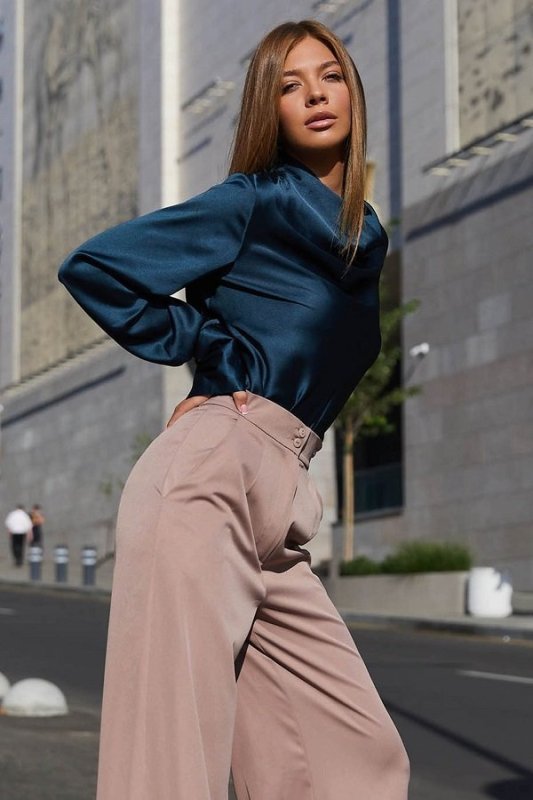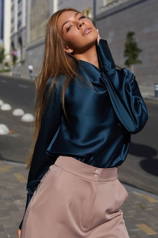 Красива блуза з шовкової тканини. Горловина виробу виконана в стилі хомут створюючи на грудях розкішні хвилі з блиском тканини. Довгий рукав з високим манжетом застібається на гудзик додає легкості. Модель відмінно комбінується з брюками і спідницею, надаючи образу ділового або вечірнього стилю.