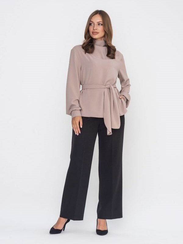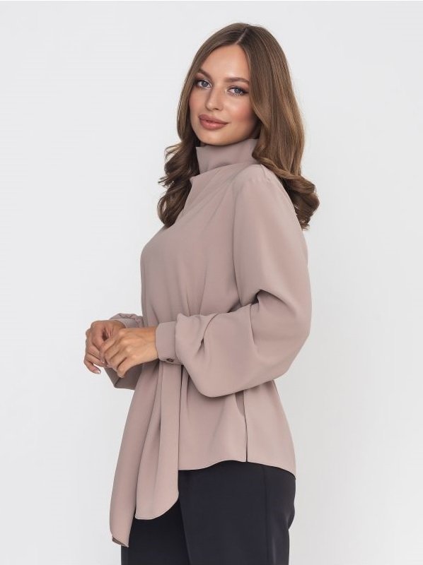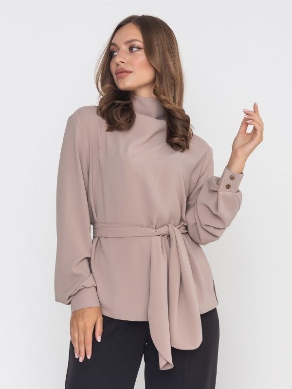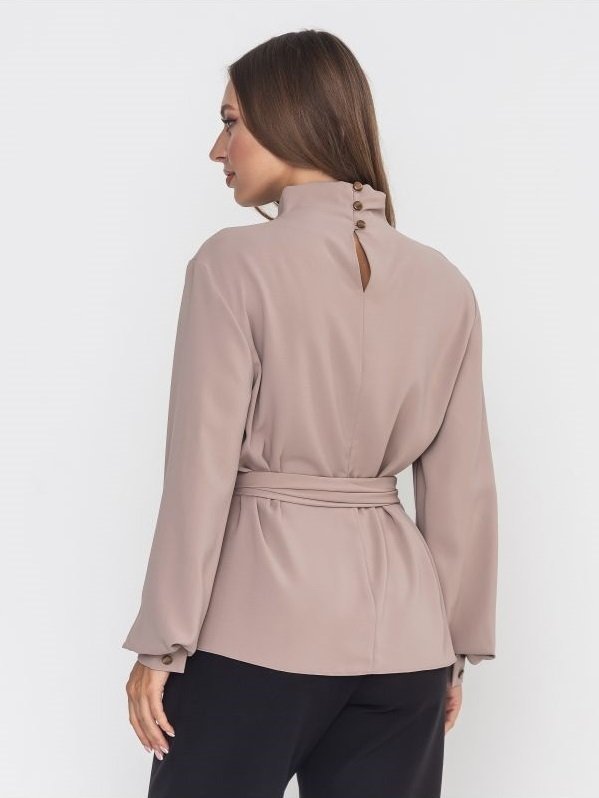 Блуза вільного крою з комірцем-стійкою, який комфортно прилягає до шиї. У бічних швах передбачені розрізи. Рукава на широких манжетах застібаються на декоративні гудзики, пофарбовані в тон основного матеріалу. Блуза застібається по центру спинки на три гудзики на петлях. У комплекті йде знімний поясок, який можна зав'язати по-різному, створивши різні образи.
