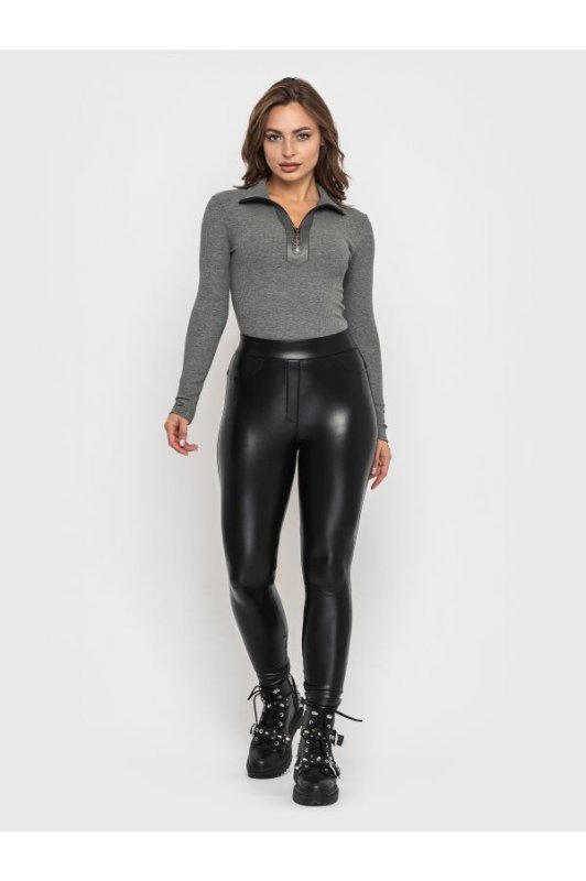 Боді-водолазка із застібкою на блискавку по центру. Окантовка навколо блискавки-екошкіра. Внизу застібається на кнопки. На рукаві нашивка-металевий декор з найменуванням бренду.