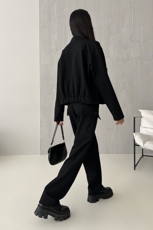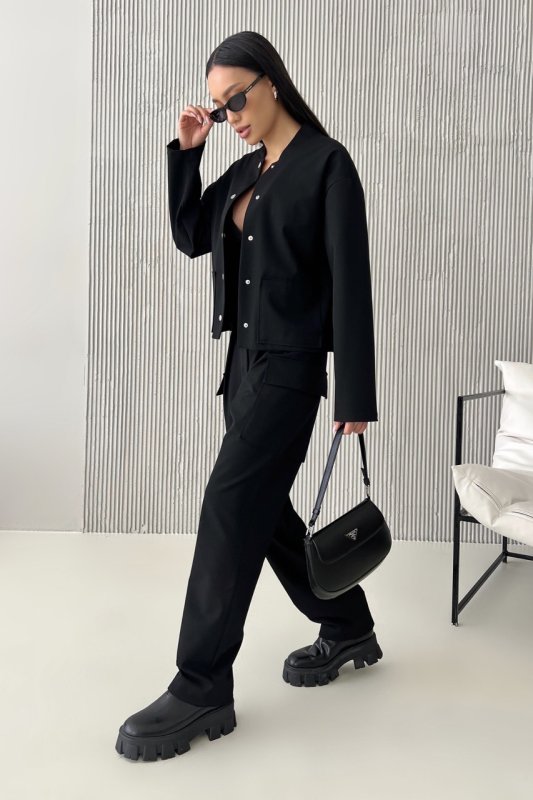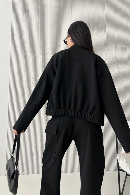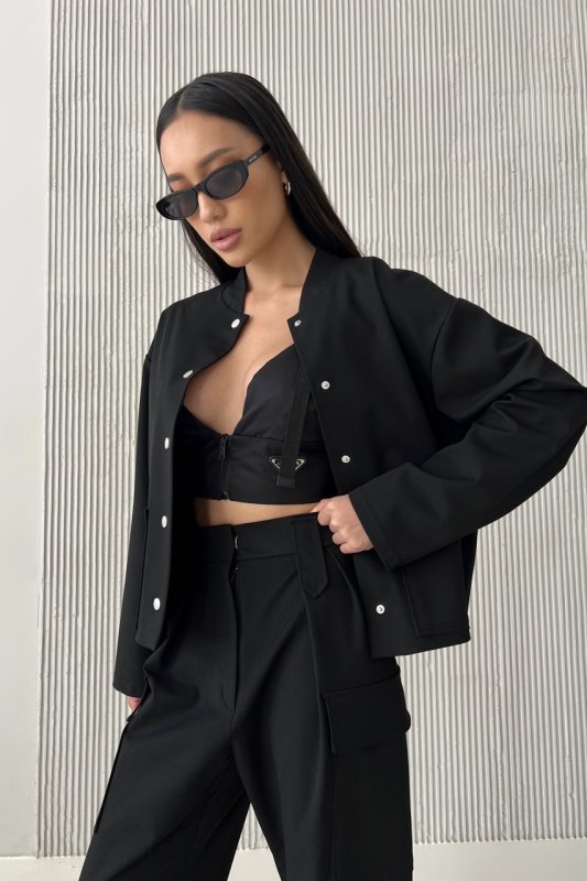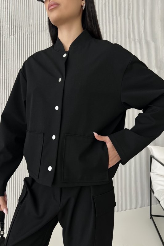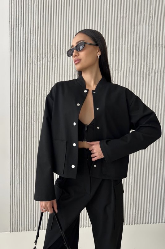 Бомбер вільного крою з щільної тканини. Застібка на кнопки. Силует oversize, дві накладні передні кишені та резинка по спинці.