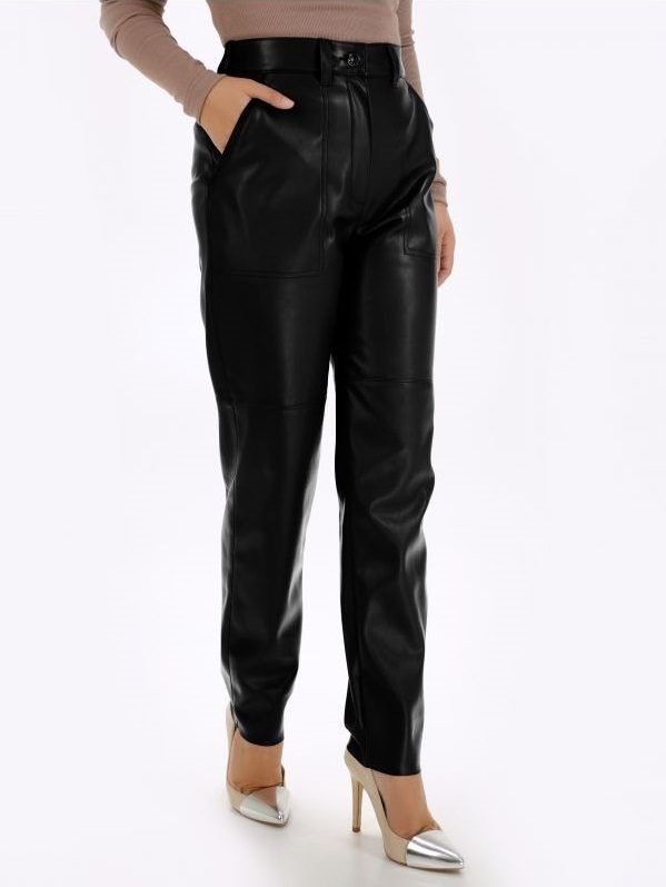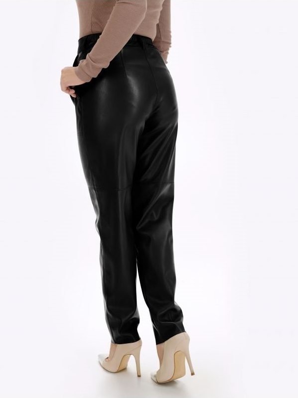 Стильні, елегантні брюки-банани. Звужений крій, висока посадка. Притачной пояс застібається на гудзик і блискавку, ззаду - еластична вставка. По поясу проходять шлевки для ременя. З боків косі кишені, оформлені листочками. Необроблені краї штанів.