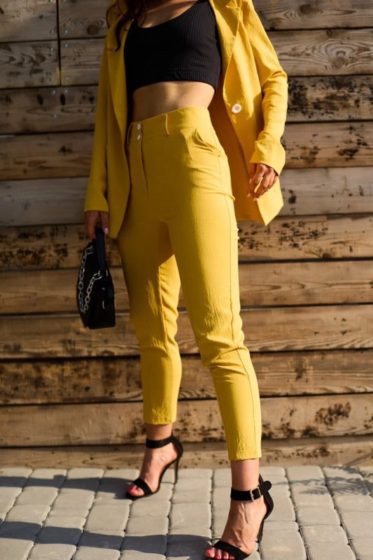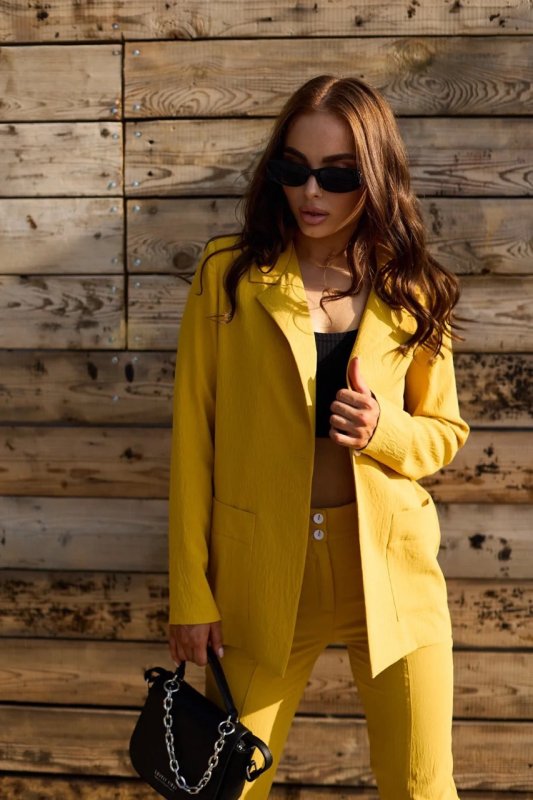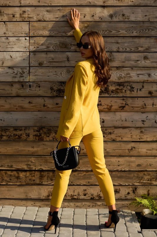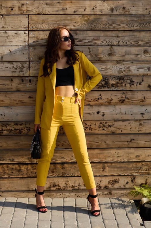 Брючний костюм лаконічного крою ідеальне рішення для поновлення гардеробу. Ніжний колір легко поєднується з топом, майкою або сорочкою. Штани з високою посадкою. На піджаку є накладні кишені.