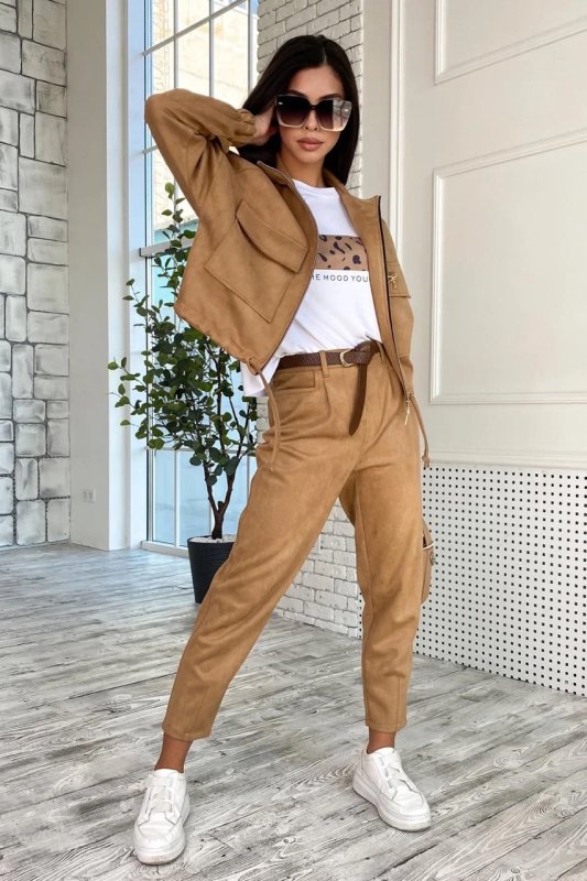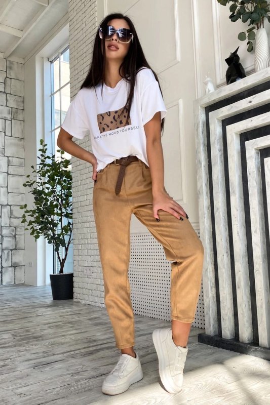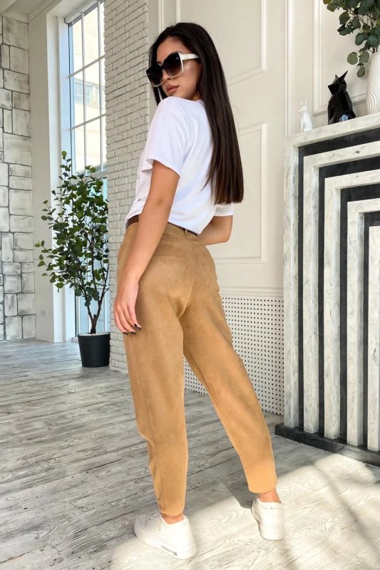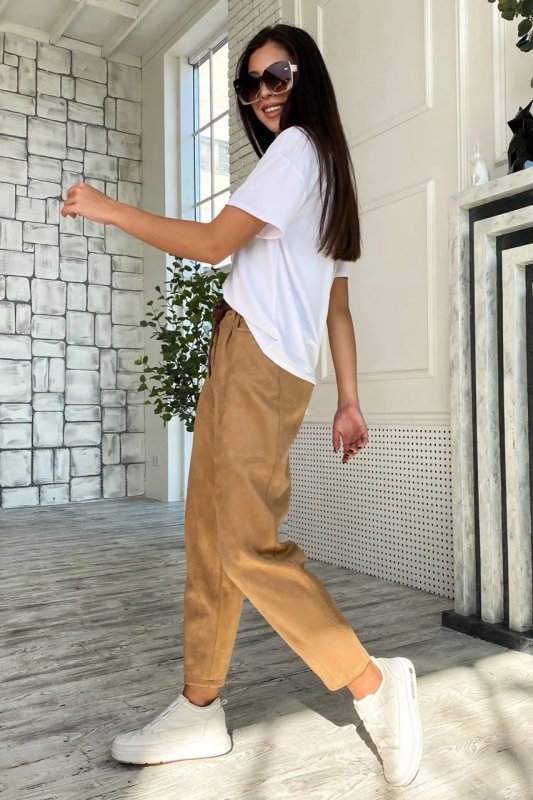 Широкі штани із високою посадкою. Матеріал – замша на дайвінгу. Фасон вільний, широкий. Виточення внизу штанів, кишеня з відрізним бочком.