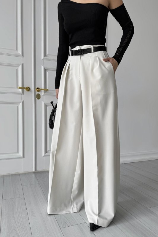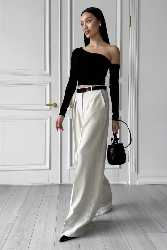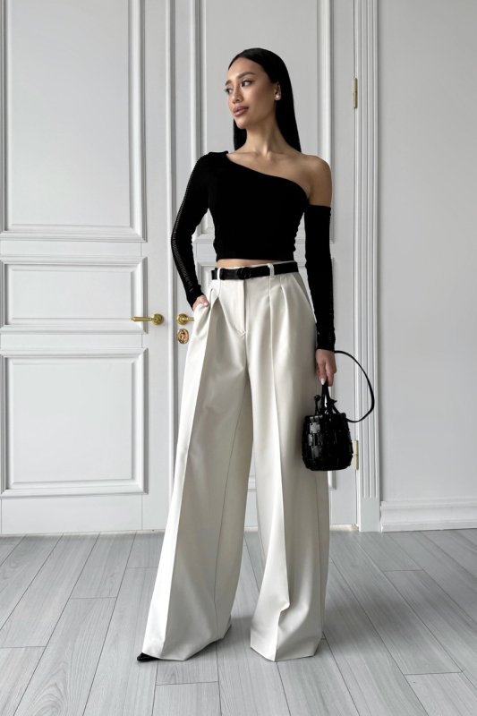 Брюки мають широкий крій, середню посадку та кишені з боків. Дизайн завершують стрілки спереду.