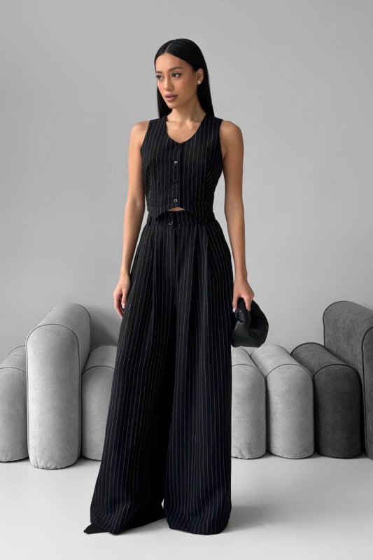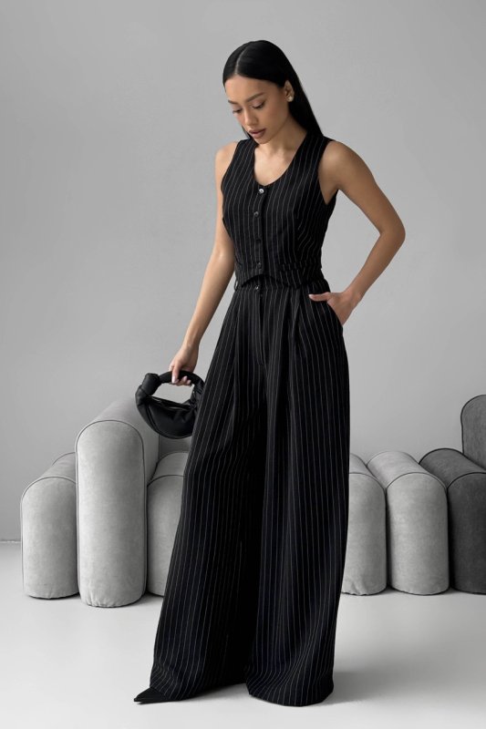 Класичні брюки-палаццо прямого крою, з складками по переду. Модель з комфортною високою посадкою стане базовим елементом для створення повсякденного чи ділового образу. Модель доповнене зручними бічними кишенями. По спинці на талії – резинка, ширина шльовок– 6 см.