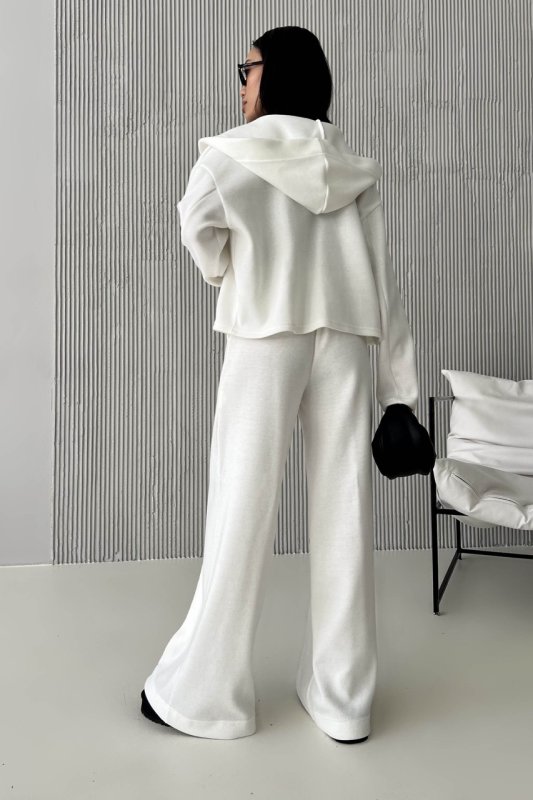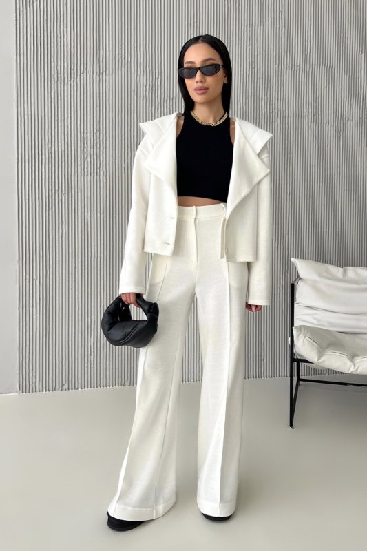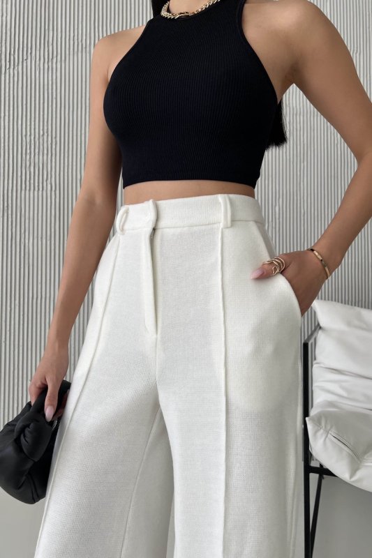 Брюки кюлоти, посадка середня, стрілки на штанинах зафіксовані. Широкий відрізний пояс, застібається на металевий крючок та блискавку. Дві бічні кишені.
