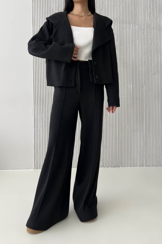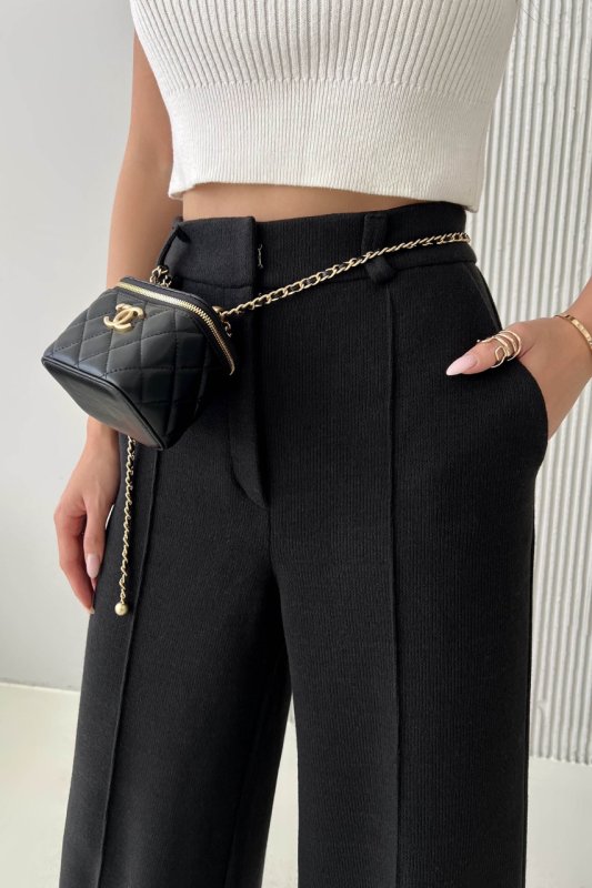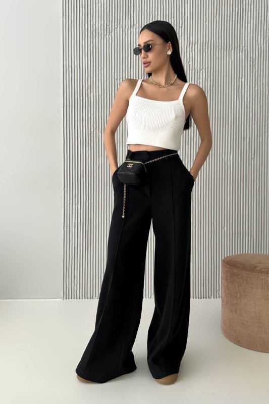 Брюки кюлоти, посадка середня, стрілки на штанинах зафіксовані. Широкий відрізний пояс, застібається на металевий крючок та блискавку. Дві бічні кишені.