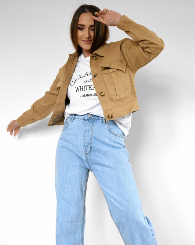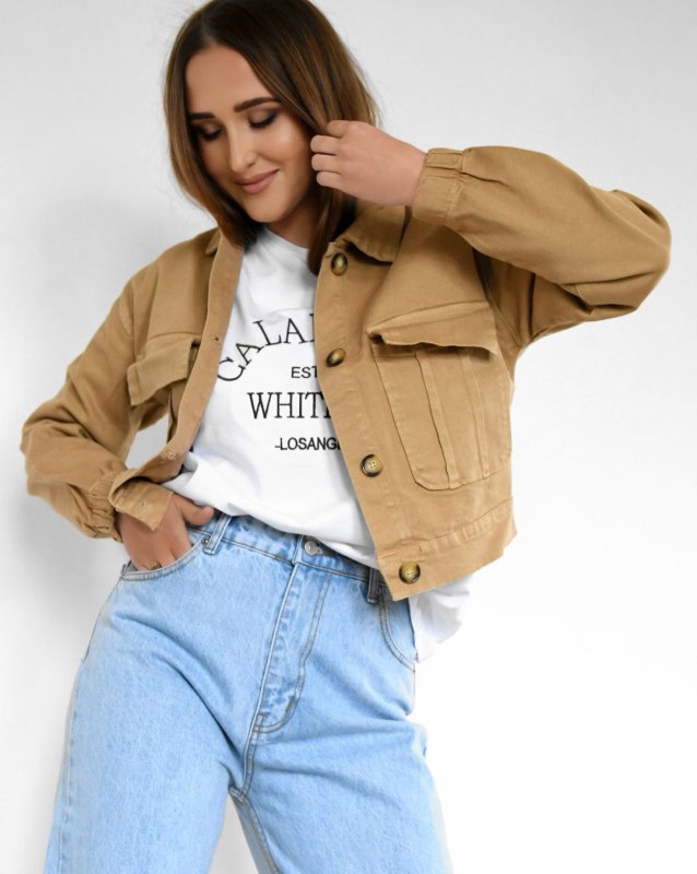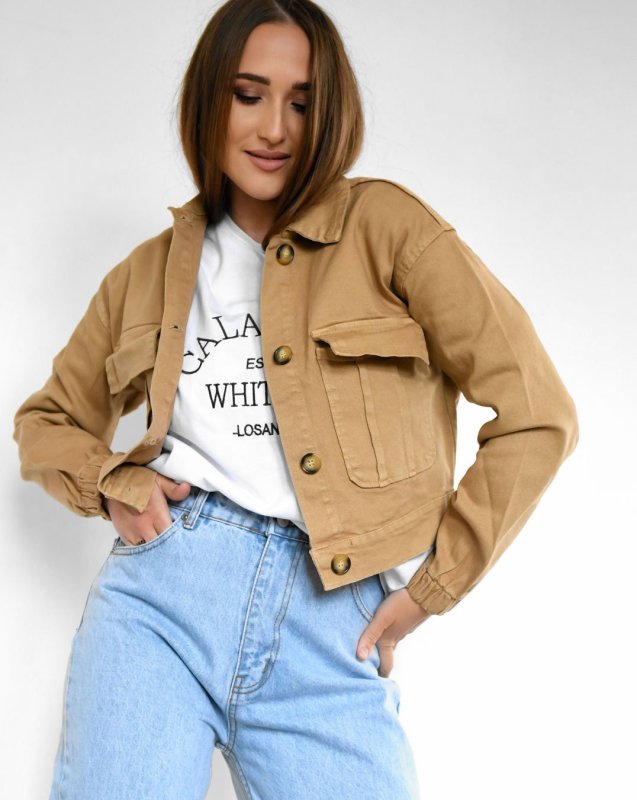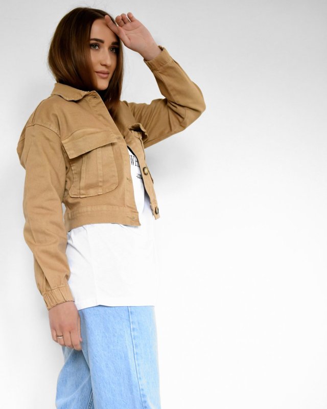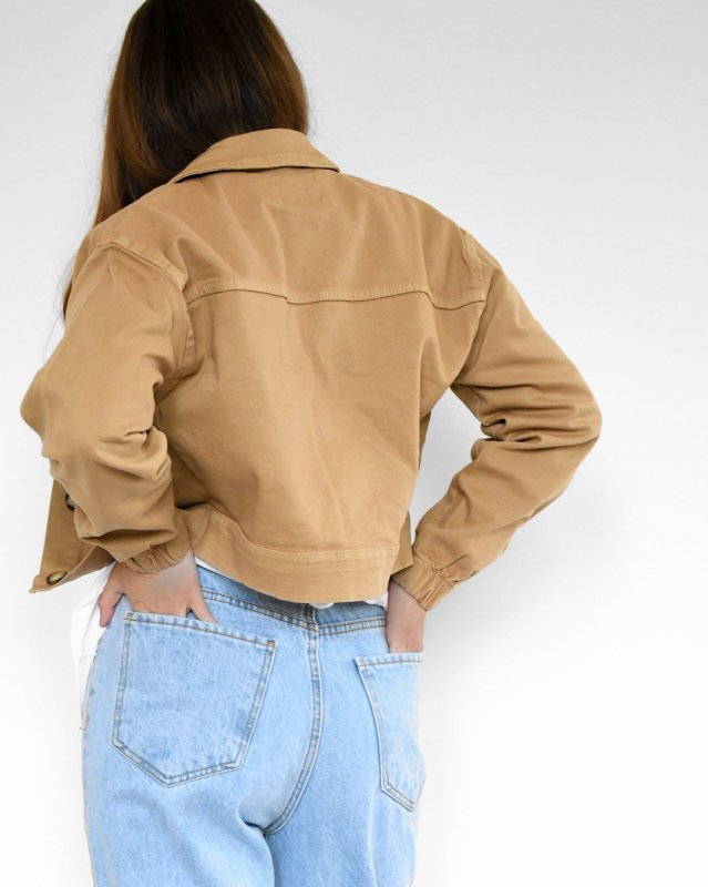 Коротка джинсова куртка. Відкладний комір, довгий рукав на резинці. На грудях 2 накладні кишені з клапаном. Застібка на ряд вінтажних гудзиків