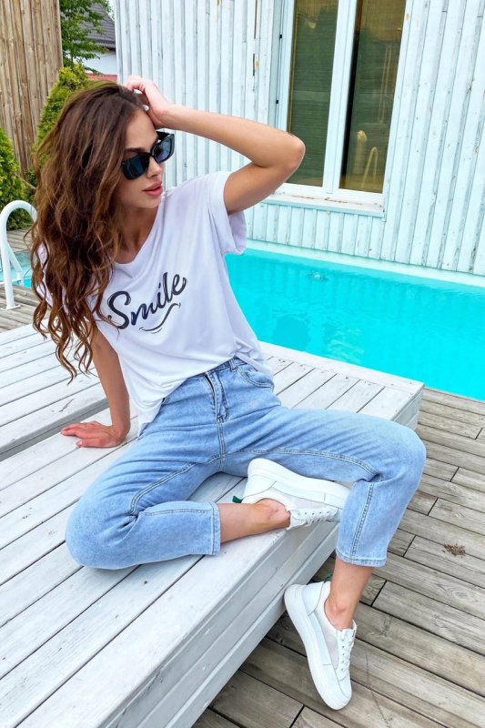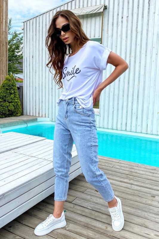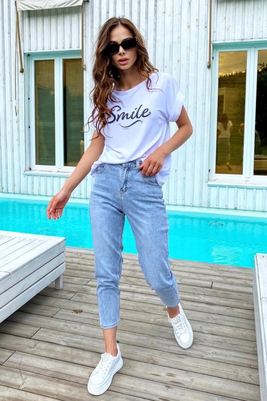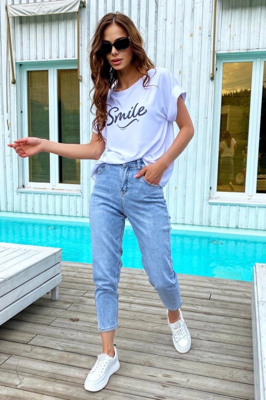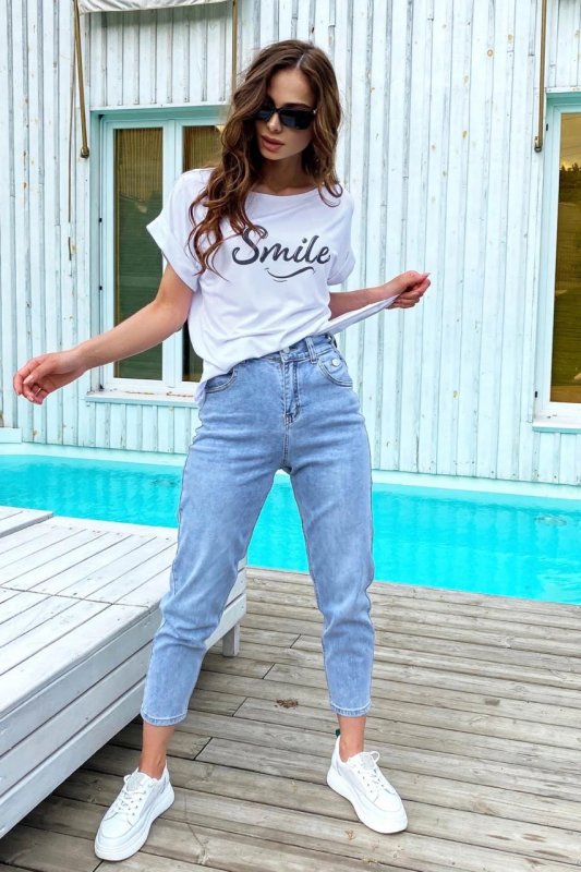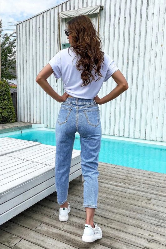 Джинси – унікальна річ у гардеробі кожної дівчини. Вони легко стилізуються з футболкою, светром, джемпером чи сорочкою. У джинсах на поясі є резинка. Застібаються на блискавку та гудзик.