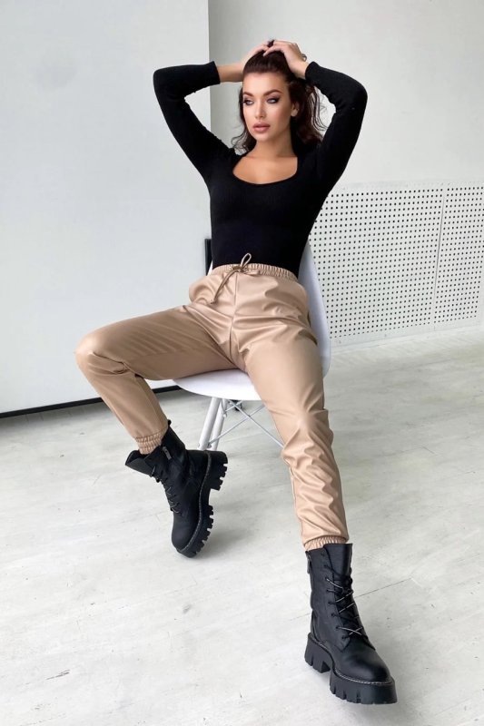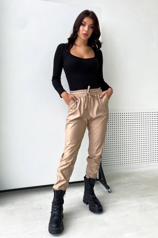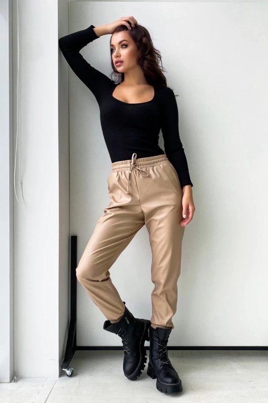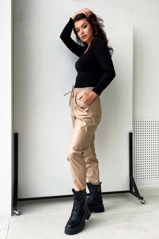 Вільні Шкіряні штани. Пояс на резинці зі шнурками. Манжети на резинці. Висока посадка. Кишені з відрізним бочком.