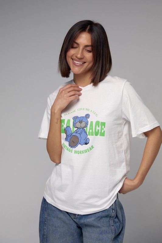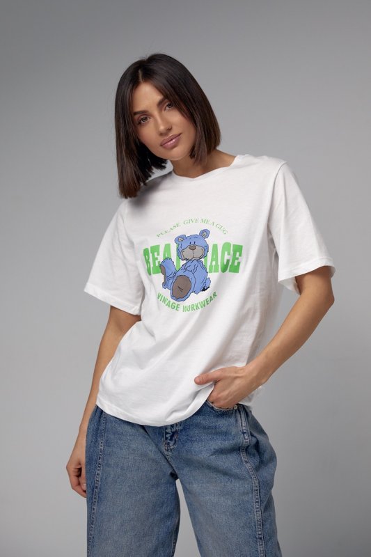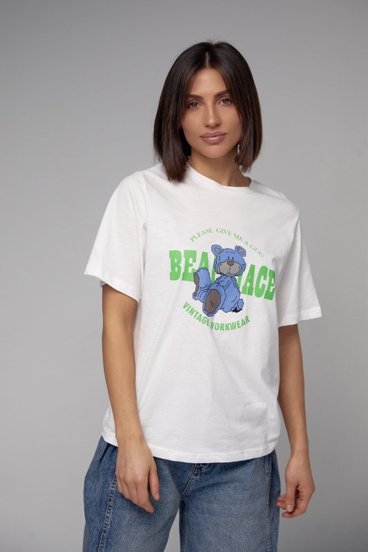 Бавовняна футболка з яскравим принтом ведмедя - 2410 біла