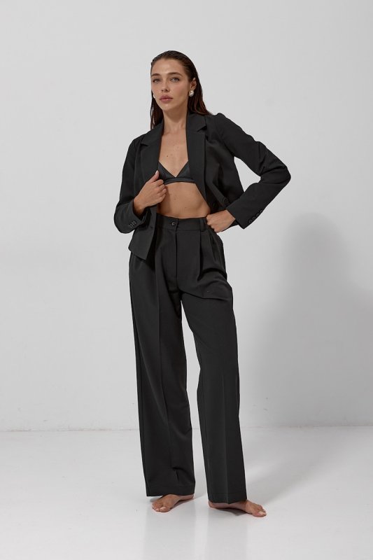 Класичний костюм укорочений жакет, брюки палаццо. Жакет з двубортною застібкою, комір піджачного типу. Пілочка із декоративною кишенею, з талієвими виточками. Рукава втачні, довгі, двухшовні, по низу шлиця і гудзики. Брюки палаццо прямого крою. На талії шльовки для зйомного поясу. Застібка: гудзик і прихована молнія. Передні половинки зі стрілками і складками. Кишені знаходяться в бічних швах. Задні половинки із виточками.