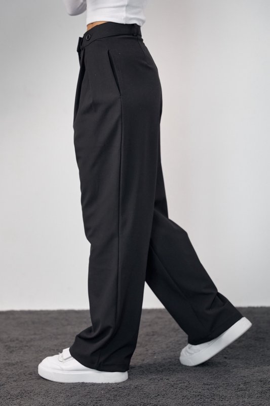 У цій моделі краї низу прямі, а втачний пояс йде без резинки та з петлями для ременя. Застібається виріб на два потаємні гудзики та на блискавку. Також на поясі пришиті два декоративні гудзики, які фіксують бічний нахльост і таким чином формує складку. Ззаду угорі є вертикальні виточки. Для більшого комфорту штани мають прорізні кишені.