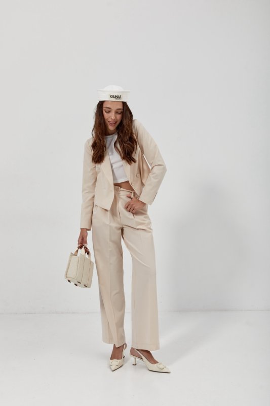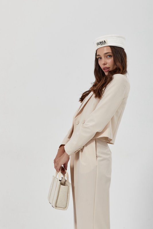 Класичний костюм укорочений жакет, брюки палаццо. Жакет з двубортною застібкою, комір піджачного типу. Пілочка із декоративною кишенею, з талієвими виточками. Рукава втачні, довгі, двухшовні, по низу шлиця і гудзики. Брюки палаццо прямого крою. На талії шльовки для зйомного поясу. Застібка: гудзик і прихована молнія. Передні половинки зі стрілками і складками. Кишені знаходяться в бічних швах. Задні половинки із виточками.