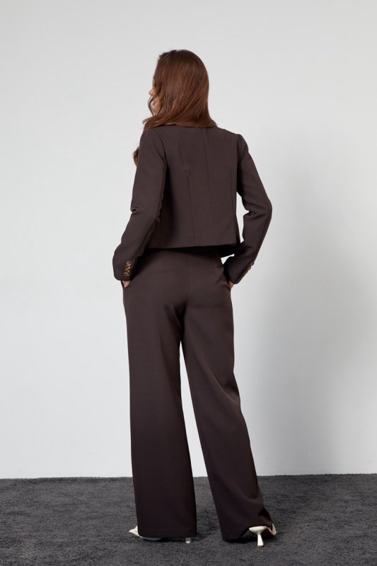 Класичний костюм укорочений жакет, брюки палаццо. Жакет з двубортною застібкою, комір піджачного типу. Пілочка із декоративною кишенею, з талієвими виточками. Рукава втачні, довгі, двухшовні, по низу шлиця і гудзики. Брюки палаццо прямого крою. На талії шльовки для зйомного поясу. Застібка: гудзик і прихована молнія. Передні половинки зі стрілками і складками. Кишені знаходяться в бічних швах. Задні половинки із виточками.