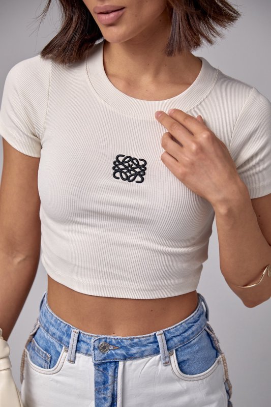 Коротка футболка в рубчик з вишивкою - 231029 бежева