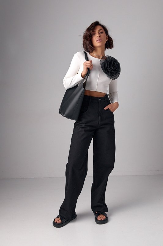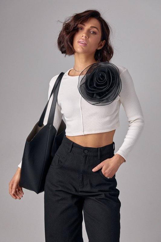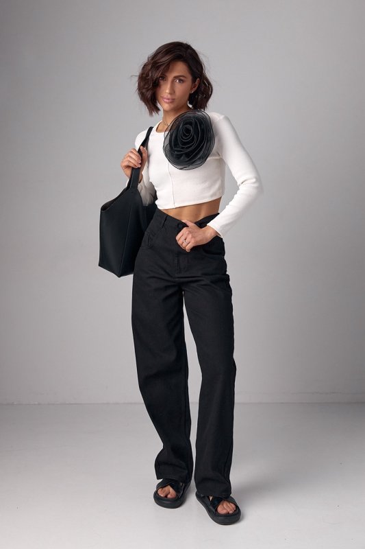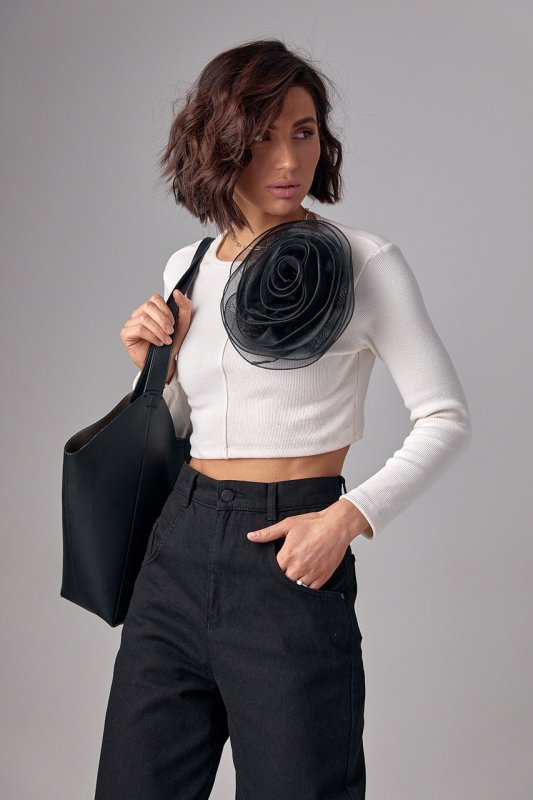 Короткий джемпер у рубчик з об'ємною квіткою - 12380 чорний