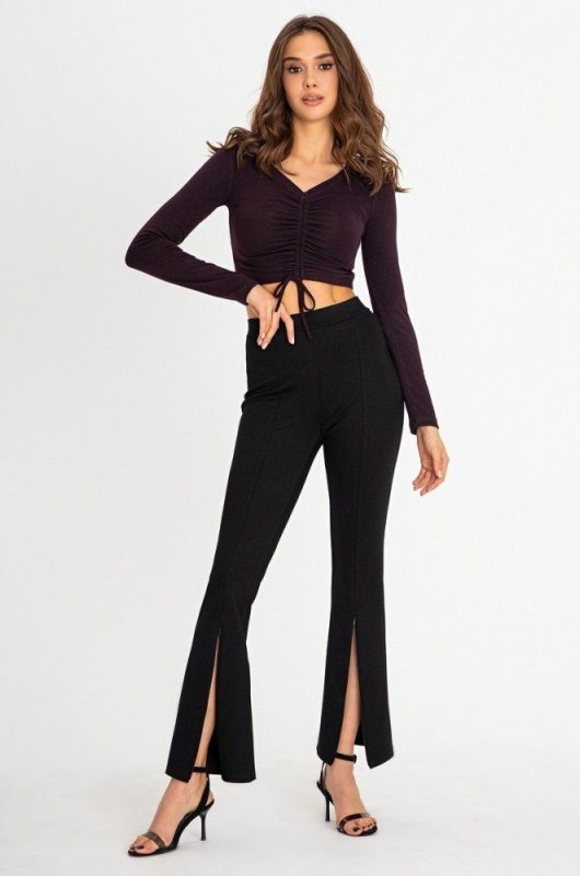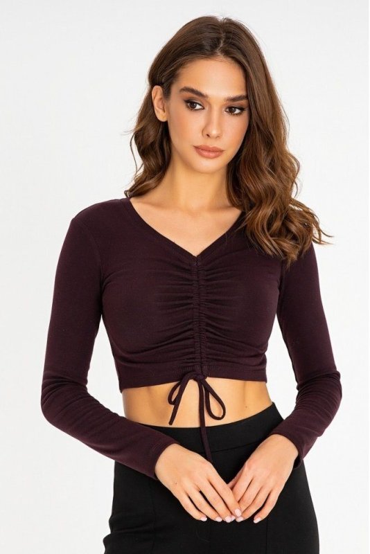 Короткий топ з трикотажу віскози з драпіруванням і куліскою уздовж полички. Модель облягаючого фасону з трикутним вирізом. Топ ідеально підійде для дружніх вечірок, посиденьок в кафе, прогулянок по місту.
