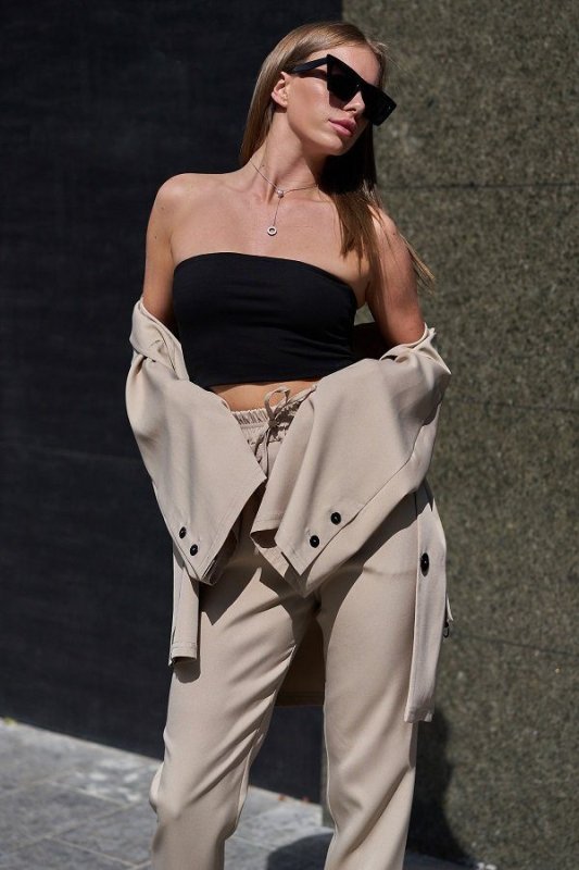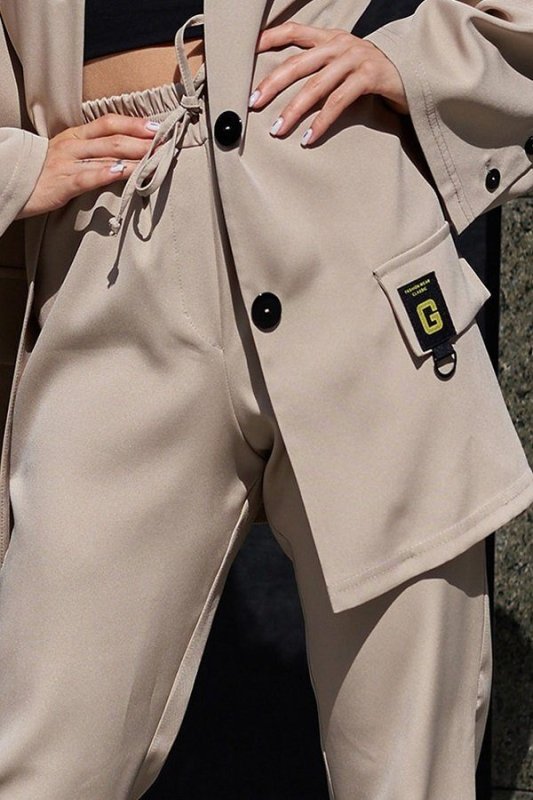 Класичний брючний костюм-двійка на основі двобортного жакета і брюк прямого крою – по праву вважається самим практичним і вишуканим предметом жіночого гардеробу. Елегантна модель брючного костюма прекрасно послужить для складання модних вуличних луків, практичних повсякденних аутфітів і романтичних ансамблів. Залежно від обраного стилю, підбирається модель певного формату, яка помітно перетворює і впливає на сприйняття вашого образу. Вишуканий крій жакета робить акценти на грудях, талії, візуально стрункішою. Практичні штани з прорізними кишенями на широкій гумці зі шнурком – додадуть Вашому образу стилю!