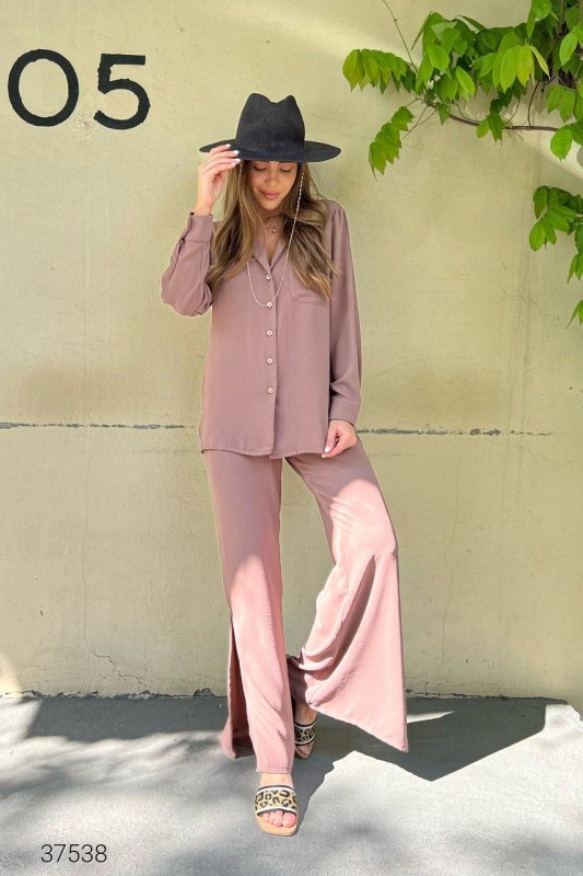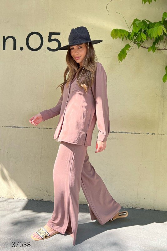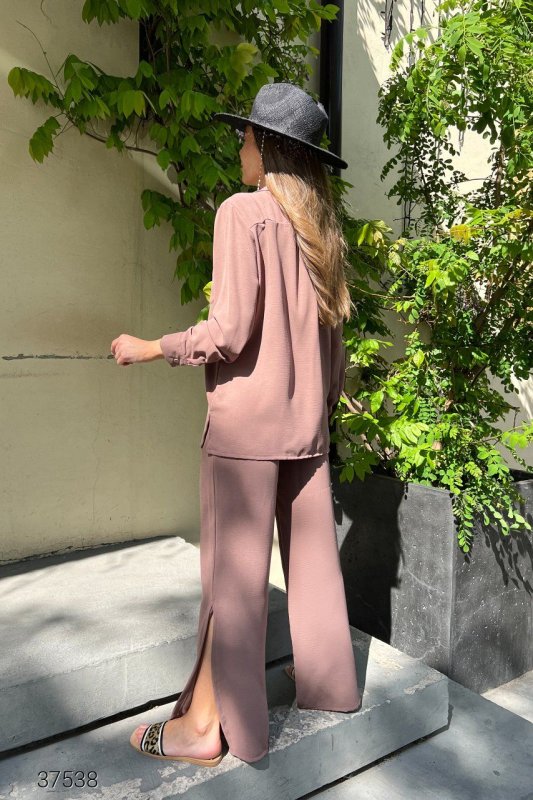 Костюм з сорочки та штанів. Сорочка застібається на гудзики. Штани на резинці із розрізами знизу.