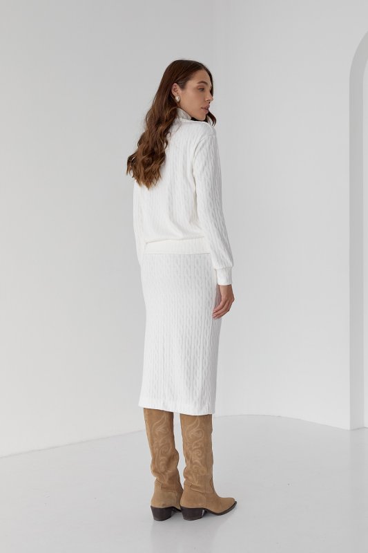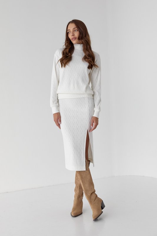 Костюм складається зі светра та спідниці. Светр крій вільний, лінія плеча приспущена. Рукава втачні, довгі. По низу виробу та по низу рукавів розпошивальний шов. Спідниця, довжина міді, облягаюча, на талії резинка, розріз у середньому шві заднього полотнища.