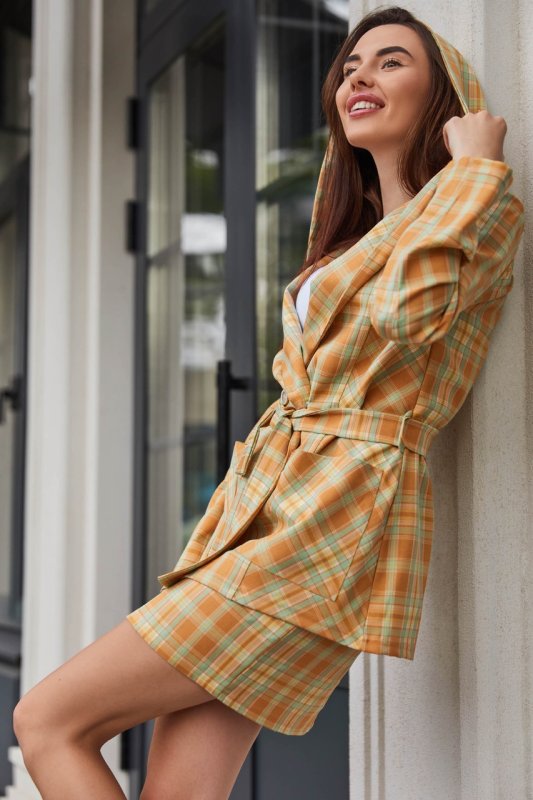 Незвичайний та оригінальний костюм зі спідницею у класичну клітку стане родзинкою у Вашому гардеробі. Костюм прямого силуету з оригінальним коміром-капюшоном, таке дизайнерське рішення надає моделі стилю та унікальності.
