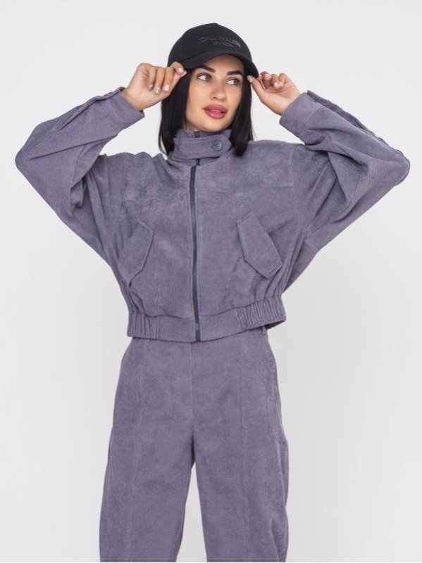 Складається з бомбера і брюк-бананів. Бомбер вільного крою застібається на блискавку. Комір-стійка доповнений шлевкой і ґудзиком. З боків зручні косі кишені з клапанами. Ззаду декоративна шлевка. Широкий манжет по краю, з боків куртки вставки з гумки.