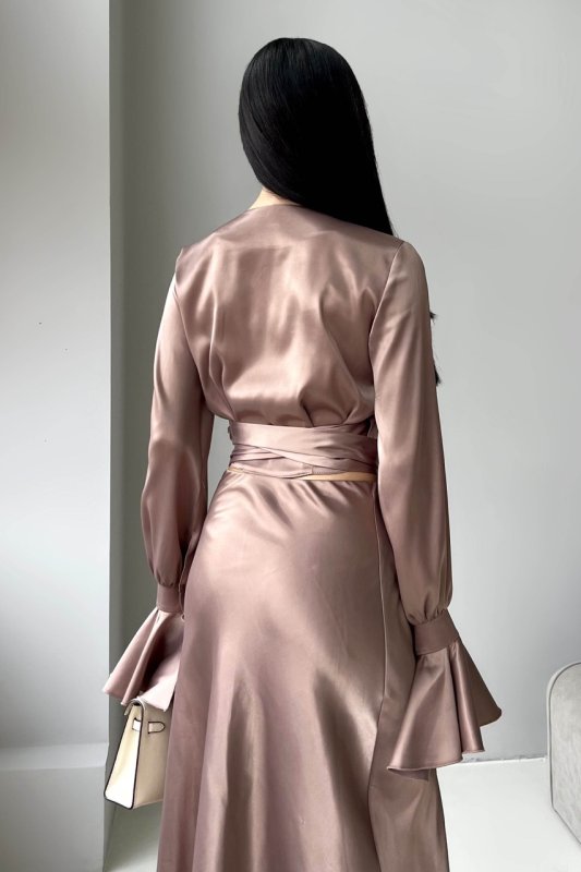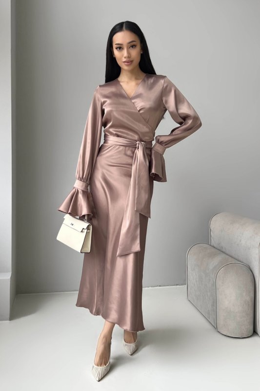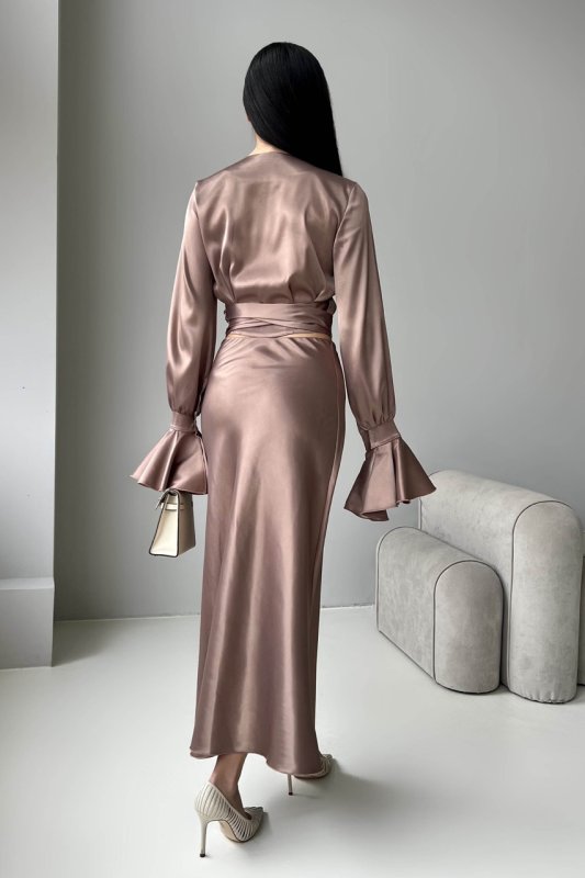 Спідниця – міді з резинкою по талії вільного крою та блуза на запАх з довгим поясом. На рукавах манжети з воланами.