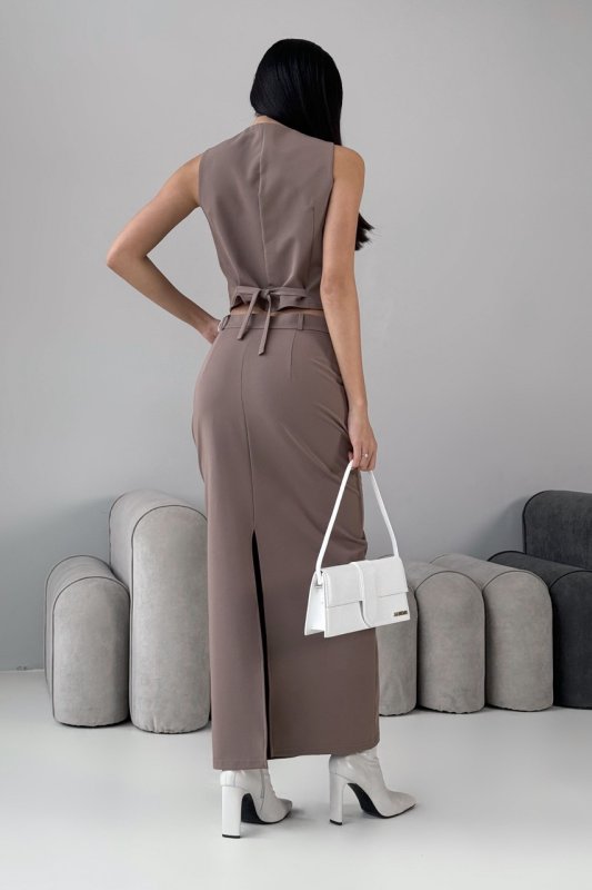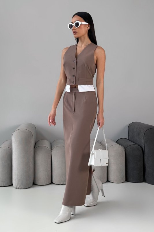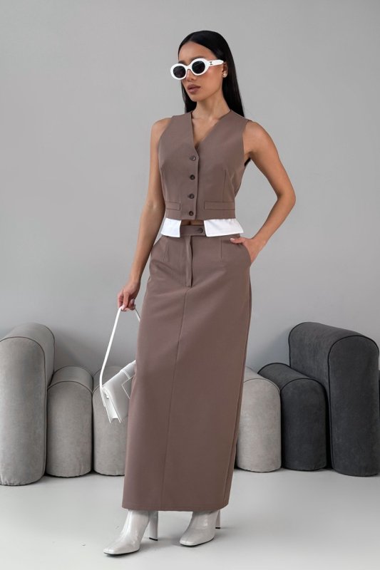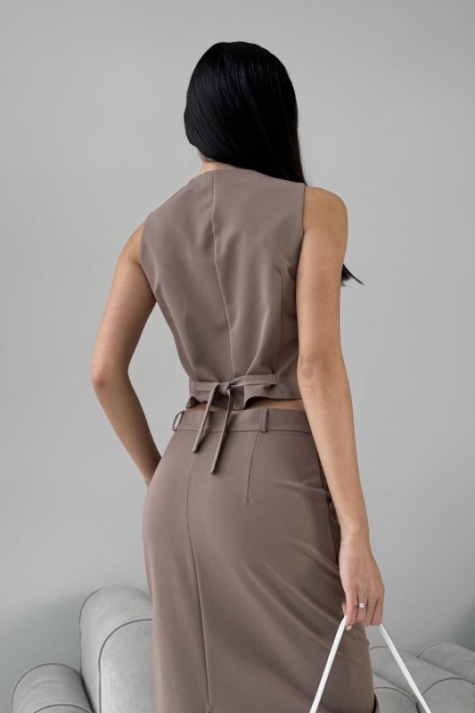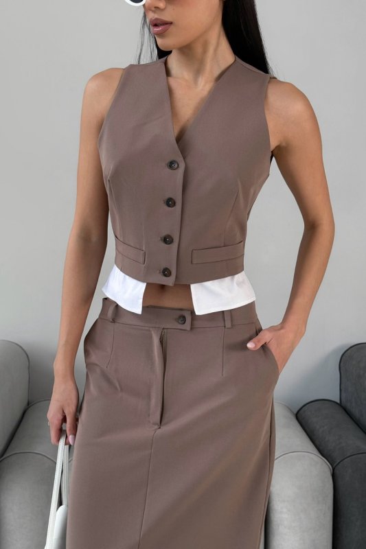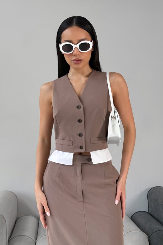 Базовий однотонний жилет із костюмної тканини - це завжди елегантно та вишукано. Класичний крій моделі доповнений кишенями-обманками з декоративними контрастними клапанами . Застібається жилет на ґудзики спереду, на спинці зав’язки. Жилет можна носити, як самостійний елемент образу, так і в комбінації з сорочкою чи блузою.