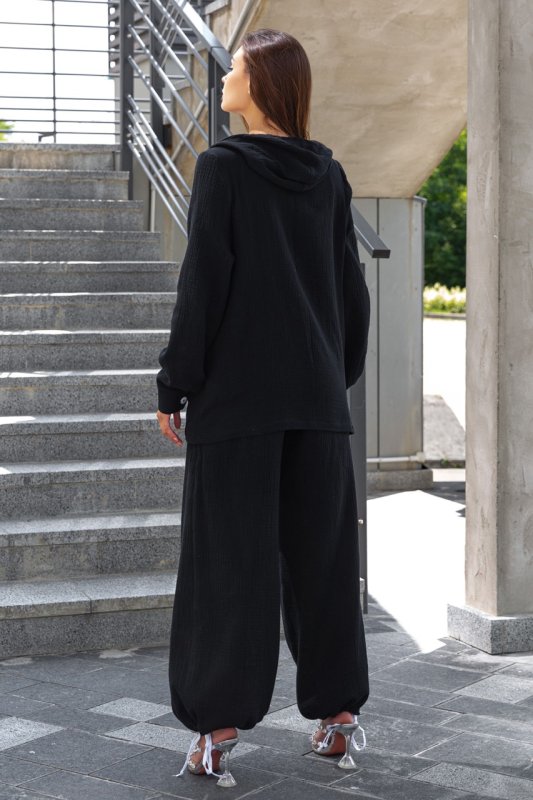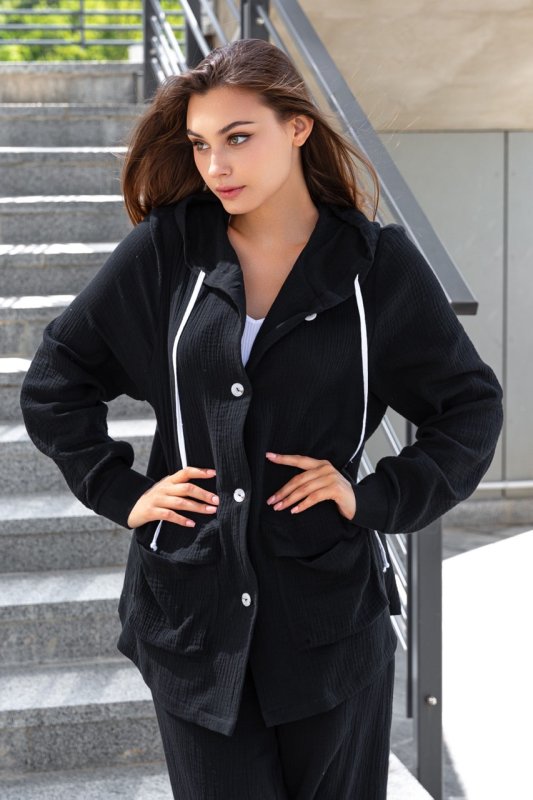 Цей легкий та повітряний костюм — ідеальний варіант для жінок, які люблять поєднувати комфорт та стиль. Сорочка оверсайз крою з довгим рукавом та штани вільного крою, які створюють ідеальну посадку на будь-якій фігурі. Сорочка оздоблена об’ємними карманами з клапанами та капюшоном з контрастним шнуром.
