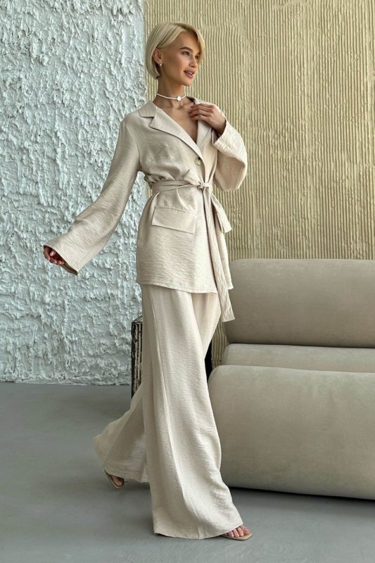 Піджак із лацканами прямого крою в комплекті із трендовими штанами палаццо – прекрасно підійде на спекотне літо.