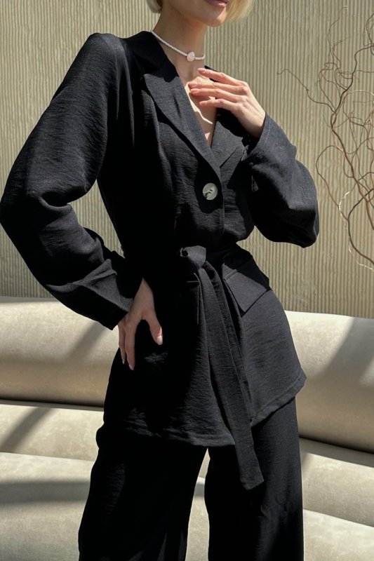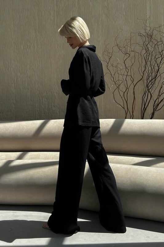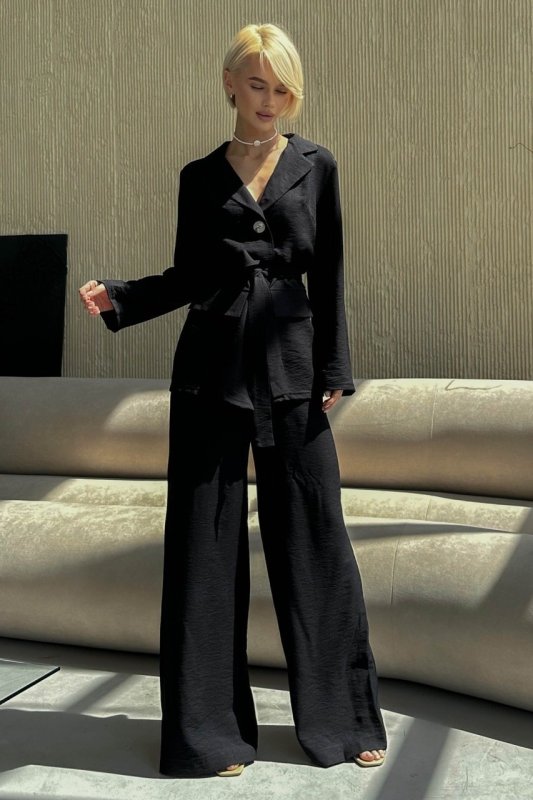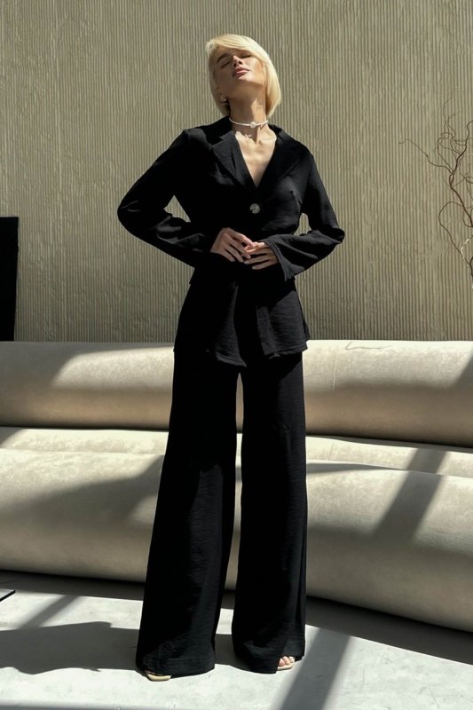 Піджак із лацканами прямого крою в комплекті із трендовими штанами палаццо – прекрасно підійде на спекотне літо.