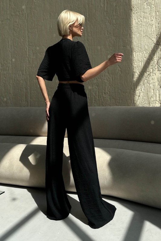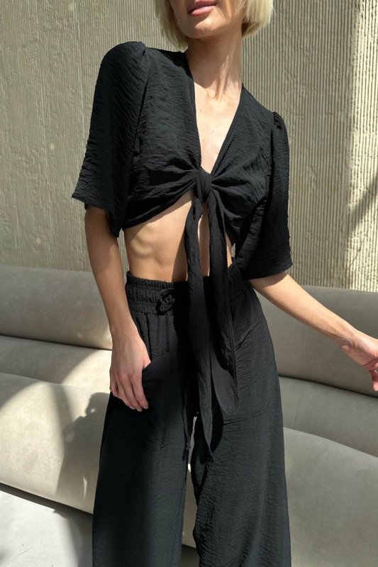 Практичний костюм із топом на зав'язках та глибоким декольте задає настрій усьому образу. Костюм виконано з легкого американського крепу. Топ із коротким рукавами. Штани вільного крою із еластичною вставкою на талії.