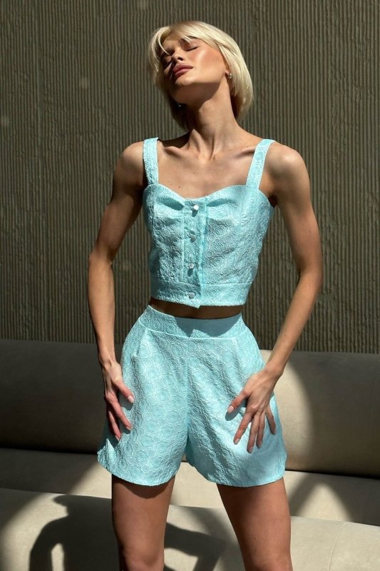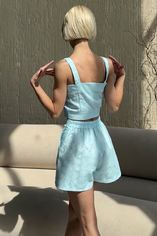 Універсальний літній комплект – топ та шорти з жаккарду. Комплект чудово підійде для вечірньої прогулянки чи відпочинку за містом. Такий костюм можна вдало комбінувати з різними елементами одягу, а значить завжди залишатися у центрі уваги та ловити тисячі компліментів!
