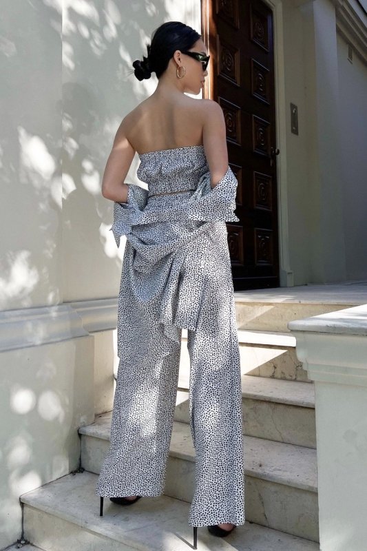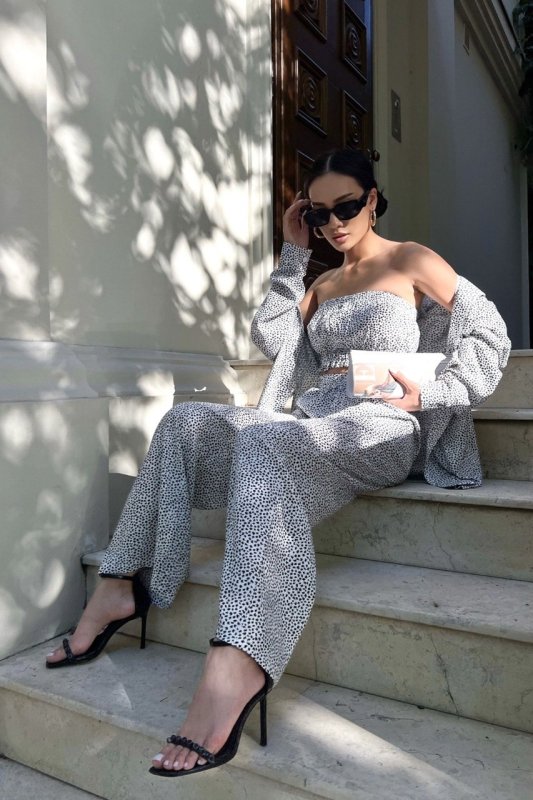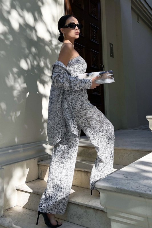 Вільний костюм прямого крою із сорочкою oversize стане вірним супутником у літню спеку. Така модель буде вдало і гармонійно виглядати зі спортивним взуттям, а також з високою танкеткою або каблуком. У бічних швах на брюках передбачені кишені, вони надають моделі зручності у використанні. Стильний топ у поєднанні з вільною сорочкою створює незабутнє враження стилю та комфорту.