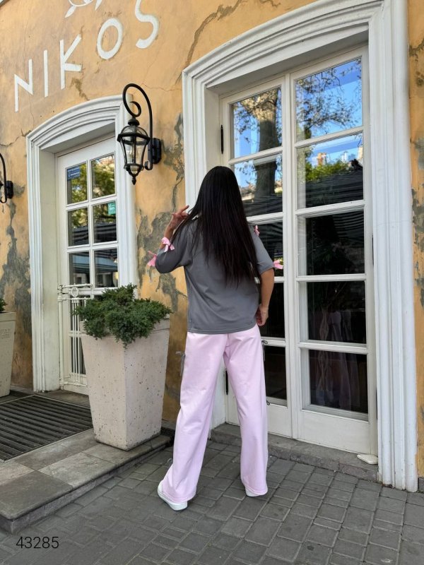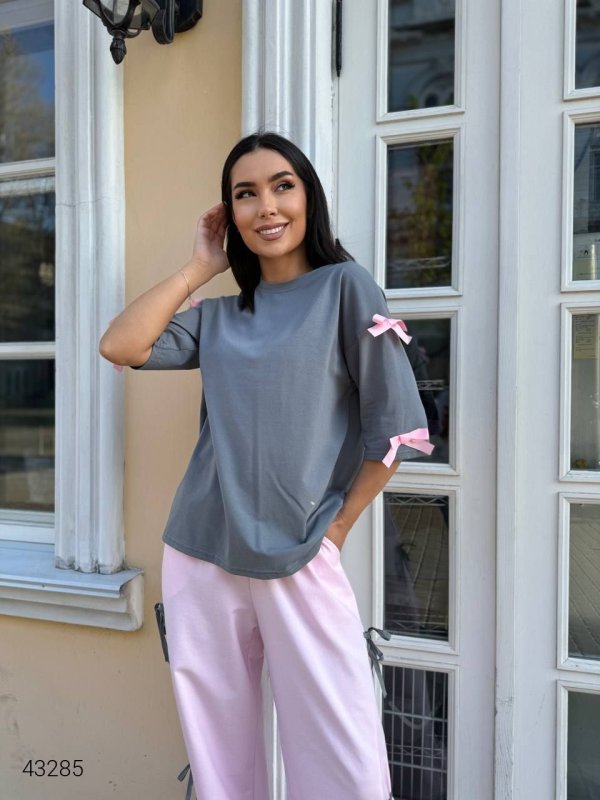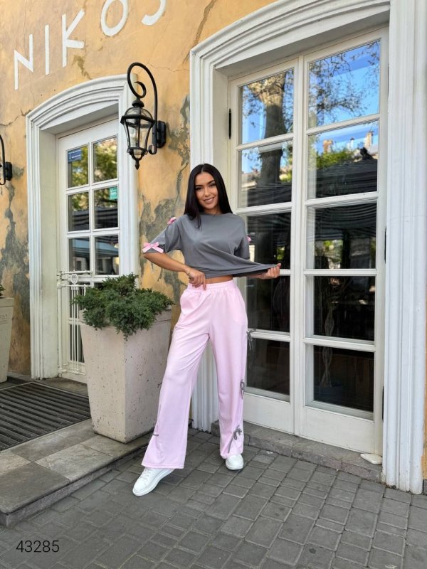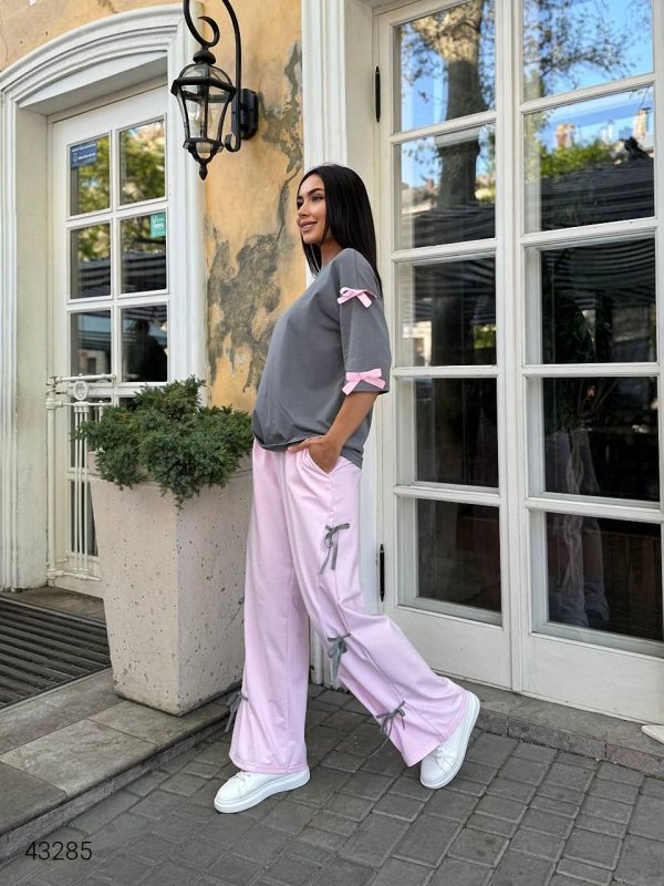 Костюм жіночий з бантиками. Модель вільного крою, ширину штанини можна коректувати бавовняними стрічками.