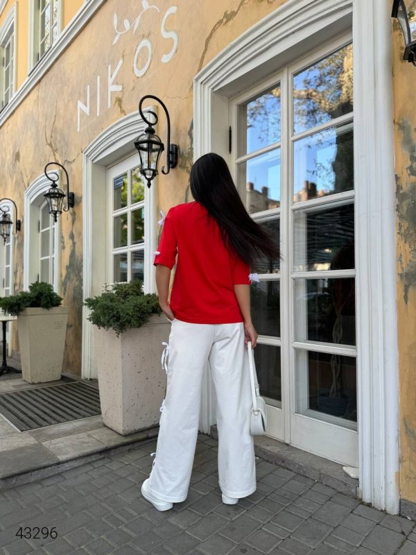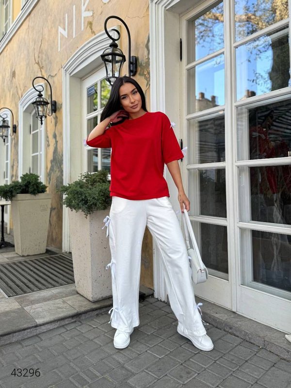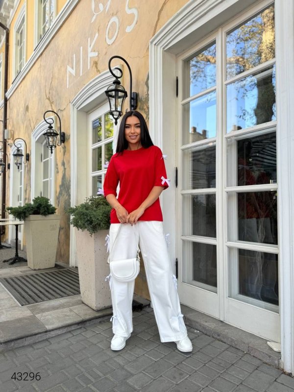 Костюм жіночий з бантиками. Модель вільного крою, ширину штанини можна коректувати бавовняними стрічками.