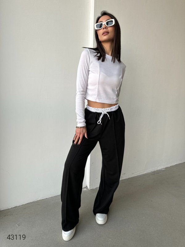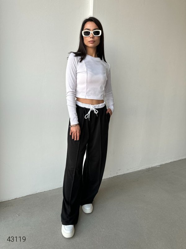 Костюм жіночий топ та штани. Рельєфний топ гарно лягає по фігурці. Штани вільного крою з акцентною резинкою та кулісою на поясі , мають стрілочки , які візуально подовжують ніжки. Тканина : топ -рубчик (х/б), гарно тягнеться, штани -2х нитка.