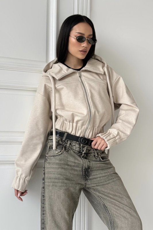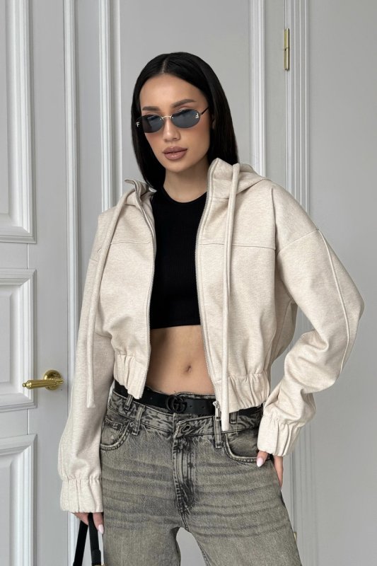 Укорочений куртка бомбер - основа сучасного стрітстайлу. Трендова модель бомберу з заниженою лінією плечей та капюшоном, який переходить у комір – стійку. По низу бомберу широка резинка. Доповнюють модель два зручних кармани по переду.