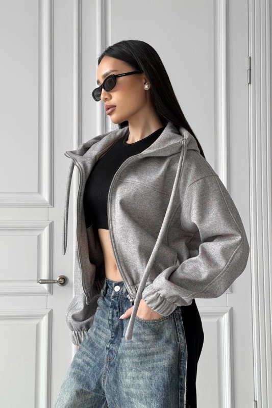 Укорочений куртка бомбер - основа сучасного стрітстайлу. Трендова модель бомберу з заниженою лінією плечей та капюшоном, який переходить у комір – стійку. По низу бомберу широка резинка. Доповнюють модель два зручних кармани по переду.