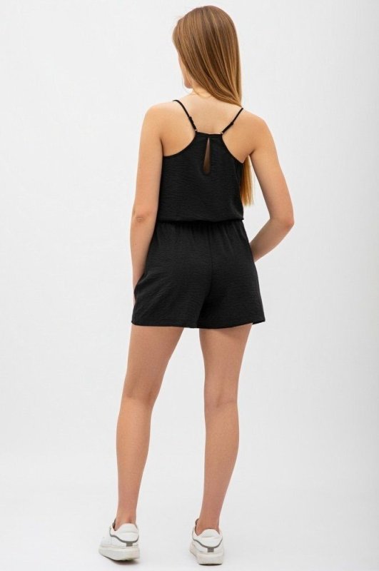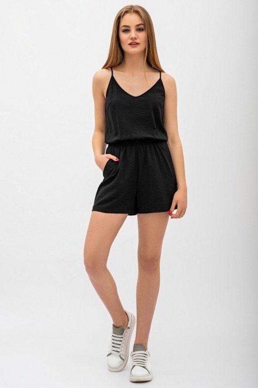 Легкий ромпер з лляної тканини на тонких регульованих бретелях, еластичною вставкою на поясі та двома прорізними кишенями з боків. Без застібок.
