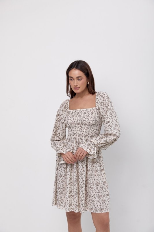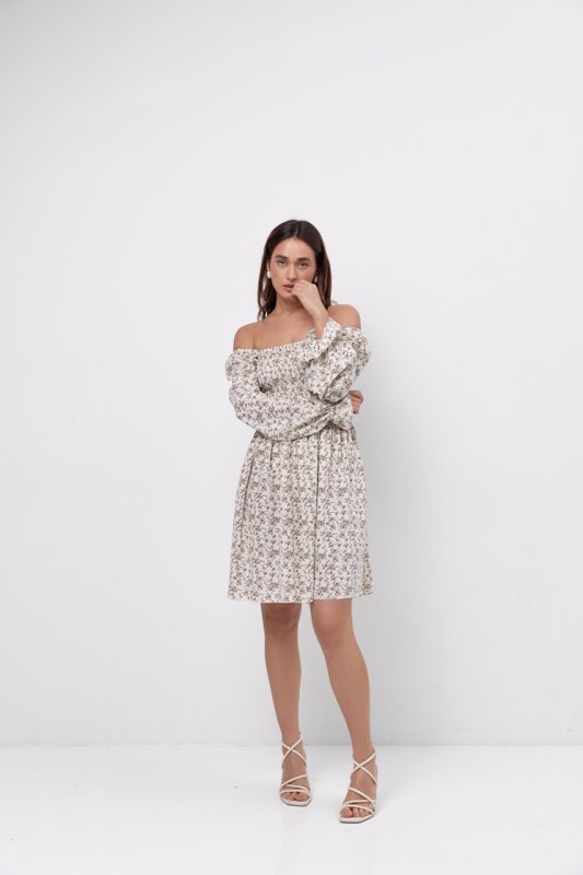 Легка сукня довжиною вище колін. Ліф зібран резинкою по всій довжині і ширині. Спідниця зібрана на талії. Рукава довгі, верхня частина зібрана резинкою і функціонує, як бритель. Низ рукава зібран з утворенням рюші. Резинка для волосся в комплекті