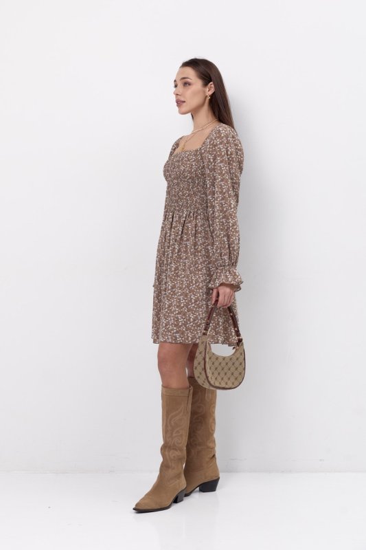 Легка сукня довжиною вище колін. Ліф зібран резинкою по всій довжині і ширині. Спідниця зібрана на талії. Рукава довгі, верхня частина зібрана резинкою і функціонує, як бритель. Низ рукава зібран з утворенням рюші. Резинка для волосся в комплекті