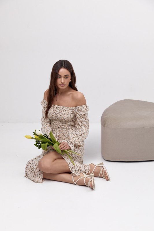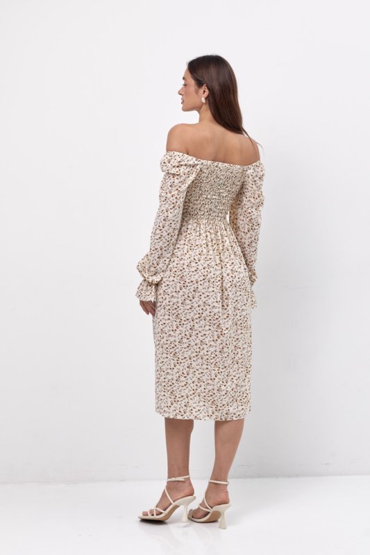 Легка сукня довжиною міді з розрізом на лівій нозі. Ліф зібраний резинкою по всій довжині і ширині. Спідниця зібрана на талії. Рукава довгі, верхня частина зібрана резинкою і функціонує, як бритель. Низ рукава зібран із утвореннням рюші. Резинка для волосся в комплекті