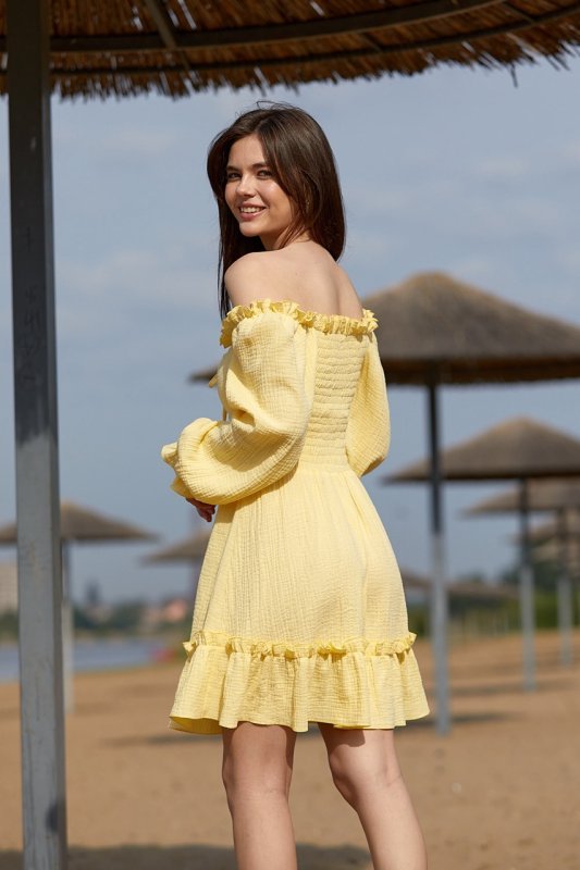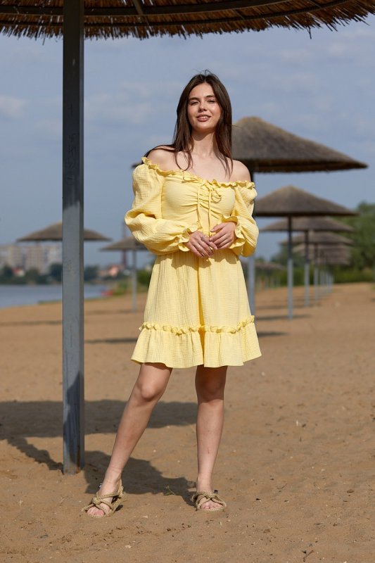 Літня муслінова сукня міні. Виріз горловини з рюшою. Перед зі зборкою на грудях. Сукня із пришивним поясом по талії. Спідниця - кльош, зібрана на талії, по низу спідниці рюша. Рукава довгі. По верху і по низу рукава резинка. Спинка зібрана резинкою, яка гарантує прилегання.