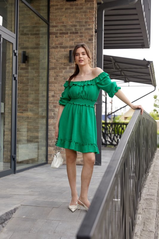 Літня муслінова сукня міні. Горловина з рюшею. На талії відрізний пояс, який зібран резинкою. Ліф і спідниця зібрані на талії. По низу сукні рюша. Рукава довжиною 3/4, верхня частина рукава зібрана і слугує бретелью, низ рукава зібран резиночкою з утворенням рюші.