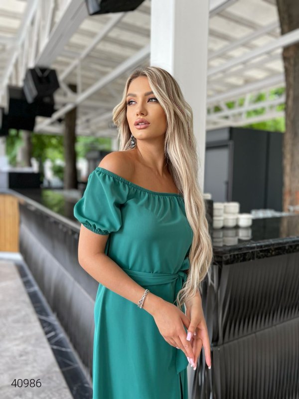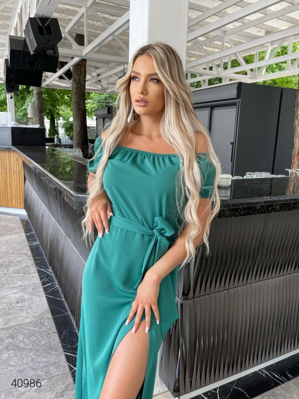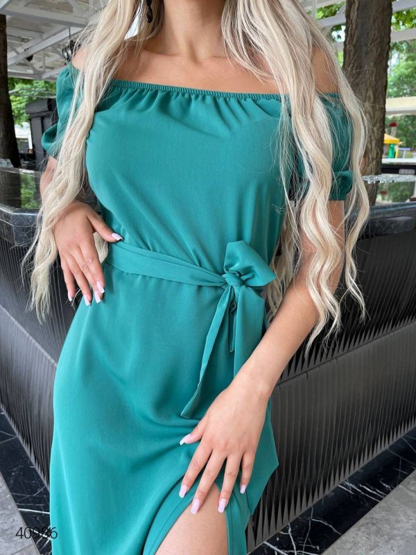 Літня сукня з відкритими плечима. Спереду розріз. Пояс у комплекті.