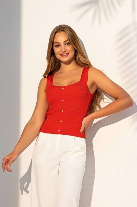 Літній топ з м'якого трикотажного полотна декорований гудзиками по поличці. Широкі нерегульовані бретелі і виріз-каре підкреслюють лінію плечей. Базова модель для будь-якого літнього образу. Вироблено в Туреччині.