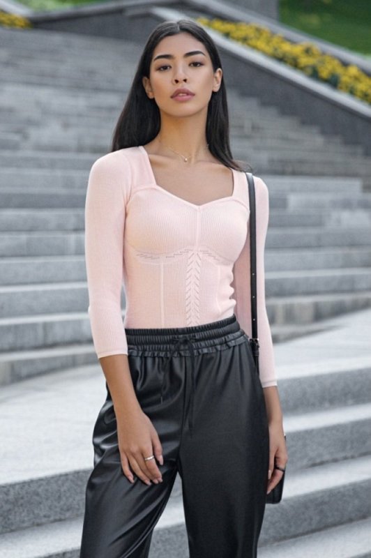 Трикотажний лонгслів з рукавом 3/4 і глибоким декольте. Родзинкою моделі є лінії підкреслюють достоїнства фігури. Лонгслів - це універсальний предмет гардероба, який можна носити круглими цілодобово протягом усього року. Вироблено в Туреччині.